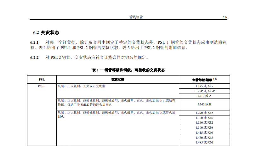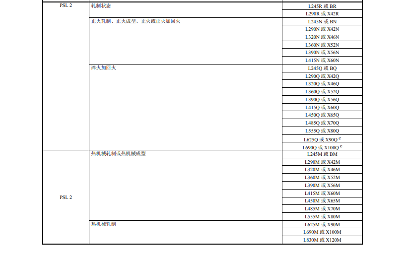 注:a.对于中间钢级,钢级应为下列格式之一:(1)字母L后跟随规定最小屈服强度,单位MPa,对于PSL2钢管,表示交货状态的字母(R、N、Q或M)与上面格式一致。(2)字母X后面的两或三位数字是规定最小屈服强度(单位1000psi,向下圆整到最邻近的整数),对PSL2钢管,表示交货状态的字母(R、N、Q或M)与上面格式一致。b.PSL2 的钢级后缀(R、N、Q或M)属于钢级的一部分。c.仅适用于无缝管。